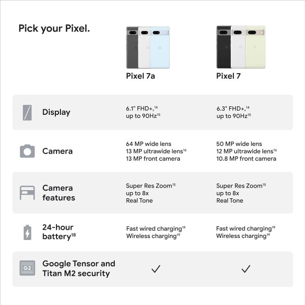 Engineered by Google, the Tensor G2 chip makes Pixel 7a faster, more efficient, and more secure. It’s the same chip that’s in Pixel 7 and Pixel 7 Pro.