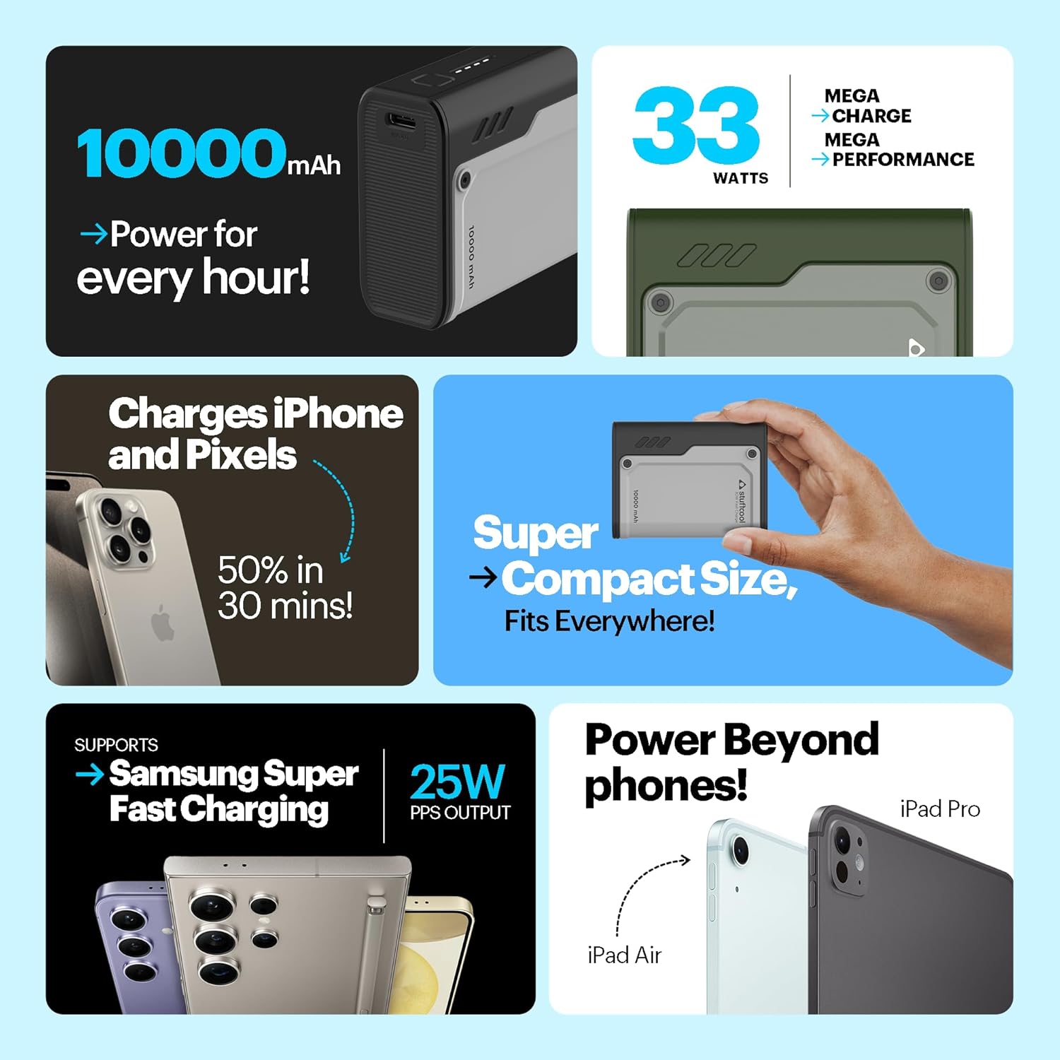 “Introducing the Mega II Powerbank – a stylish and powerful device. It has a 30W Type-C port with Power Delivery support, charging your iPhone/Pixel by 50% in 30 minutes without effort. Quick charging is guaranteed for all gadgets with the 18W USB A port. Stay informed with the digital display showing real-time updates on the 10000mAh capacity. This Powerbank is BIS certified and prioritizes safety with intelligent circuitry to guard against over-current, over-power, and short circuits. Proudly Made in India”