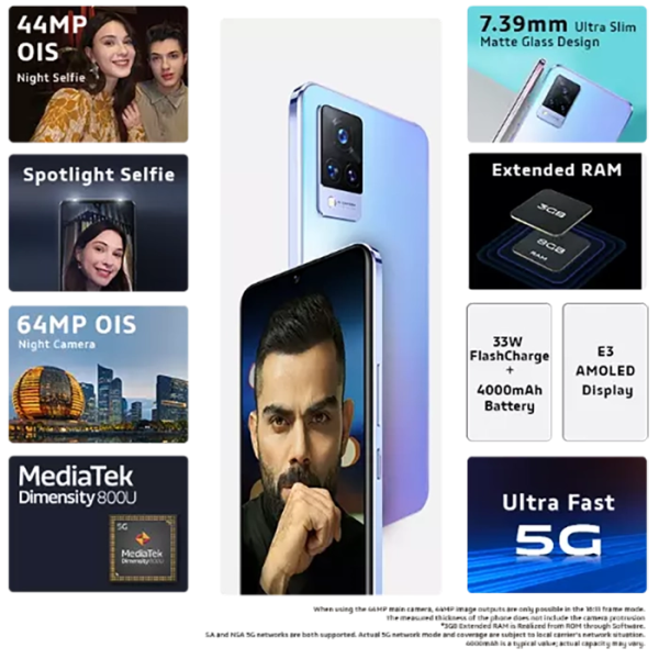 The phone comes with 64MP+8MP Rear Camera and 32MP Selfie Camera for shooting images and videos seamlessly from your phone. Shoot pictures and create memories with the Vivo V21e 5G.